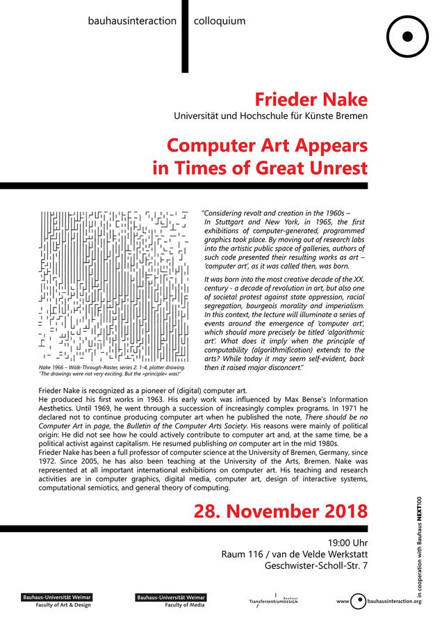 Frieder Nake is recognized as a pioneer of (digital) computer art. He produced his first works in 1963. On Wednesday, 28 November 2018, 7 p.m., we welcome him for a talk at Bauhausinteraction Colloquium.
