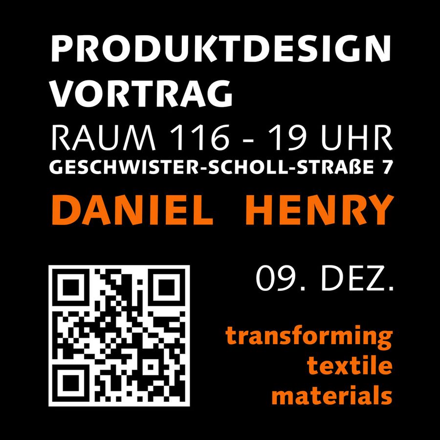 Im Rahmen des Kooperations-Projektes »2nd life« mit BMW im Studiengang Produkt-Design bei Prof. Gerrit Baptist spricht am Dienstag, 9. Dezember 2014, der Textildesigner Daniel Henry über »Transforming textile materials«.