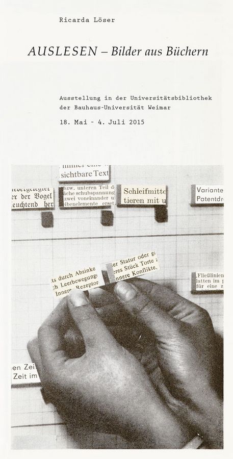 Ricarda Löser ist Typografin und Buchgestalterin und arbeitet als künstlerische Mitarbeiterin an der Fakultät Gestaltung der Bauhaus-Universität Weimar. Im Rahmen ihrer Promotion verarbeitet sie Texte aus ausgesonderten Büchern, darunter auch ehemalige Bücher der Universitätsbibliothek Weimar, zu neuen Schriftbildern. Aus den herausgelösten Textteilen entstehen neue Geschichten in Form von Collagen und Büchern.