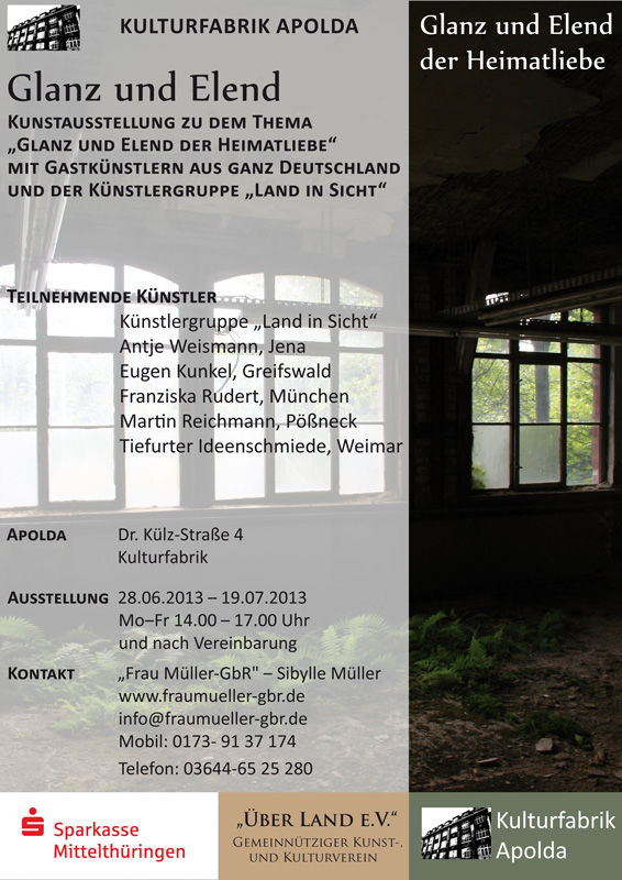 Die Kunstausstellung »Glanz und Elend der Heimatliebe« mit Gastkünstlerinnen und -künstlern aus ganz Deutschland und der Künstlergruppe »Land in Sicht« wird am Freitag, 28. Juni in der Apoldaer Kulturfabrik eröffnet.