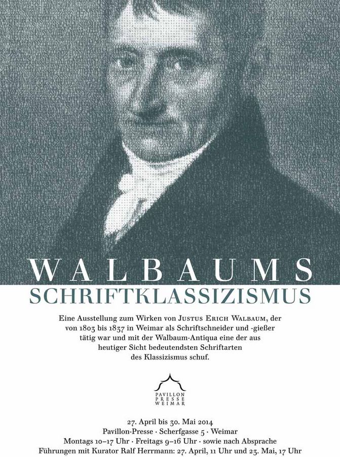 Am Sonntag, 27. April 2014, wird die Ausstellung »Walbaums Schriftklassizismus« im Druckgrafischen Museum der Pavillon-Presse eröffnet. Ralf Herrmann, Kurator der Ausstellung, Schriftgestalter und Alumnus der Visuellen Kommunikation, thematisiert darin das Werk des Schriftschneiders Justus Erich Walbaum.