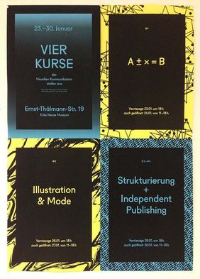 Der Studiengang Visuelle Kommunikation stellt die Ergebnisse vierer Kurse in Ausstellungen vor. Arbeiten aus dem Projekt »Strukturierung« (bei Prof. Markus Weisbeck) und dem Fachkurs »Independent Publishing« (bei Mathias Schmitt und Michael Ott) werden ab Dienstag, 29. Januar in der Ernst-Thälmann-Straße ausgestellt.