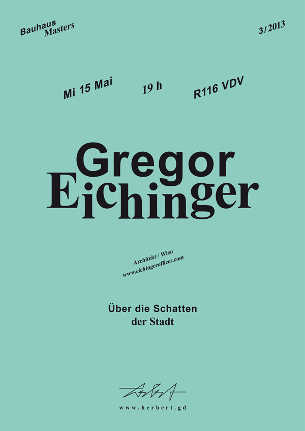 Am Mittwoch, 15. Mai 2013 findet eine weitere Veranstaltung aus der Reihe »Bauhaus Masters« statt. Zu Gast ist der Architekt Gregor Eichinger, der einen Vortrag unter dem Titel »Über die Schatten der Stadt« hält.