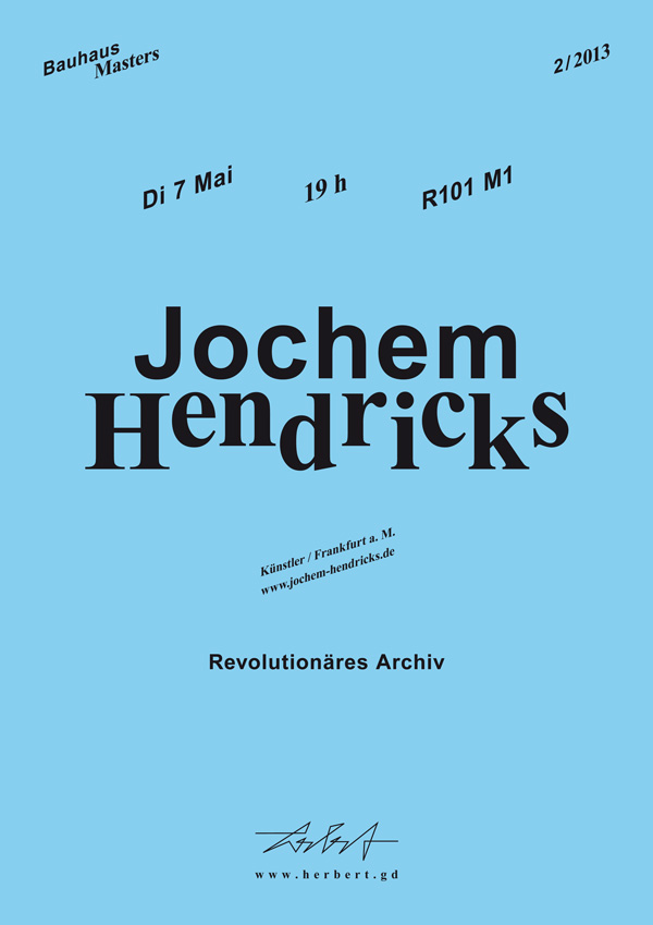 Am Dienstag, 7. Mai 2013 findet eine weitere Veranstaltung aus der Reihe »Bauhaus Masters« statt. Zu Gast ist der Künstler Jochem Hendricks, der einen Vortrag unter dem Titel »Revolutionäres Archiv« hält.