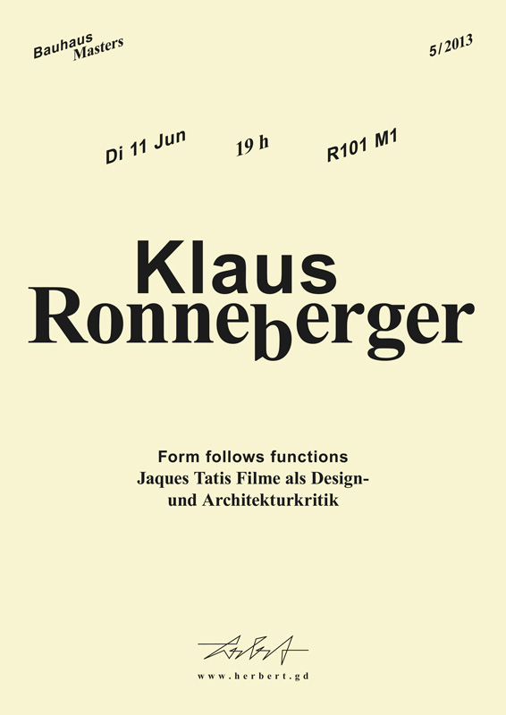 Die Filme von Jacques Tati gelten gemeinhin als komödiantische Kritik am modernen Alltagsleben. Dabei setzt sich der französische Regisseur, vor allem in Mon Oncle (1958) und Playtime (1967), auch ausgiebig mit Möbeldesign, Produktdesign, Interior Design und Architektur auseinander. Zu Zeiten des »Wirtschaftswunders« (in Frankreich unter der Bezeichnung Trente Glorieuses gelabelt) galt Design als wichtiges Symbol der Moderne. Es wurde als Mittel betrachtet sich mit der Gegenwart und, noch im stärkeren Maße, sich mit der Zukunft zu identifizieren. Anhand von Ausschnitten aus den beiden Filmen soll die Behauptung von Tati erläutert werden, dass nicht die Funktion die Form, sondern die Form das Sein bestimmt.