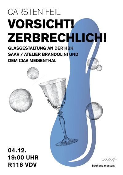 Carsten Feil wird am Dienstag, 4. Dezember 2012, 19 Uhr zum Thema »Vorsicht! Zerbrechlich!« im Rahmen der Vortragsreihe Bauhaus Masters an der Fakultät Gestaltung über Glasgestaltung an der HBK Saar / Atelier Brandolini, und dem ciav Meisenthal sprechen.