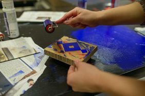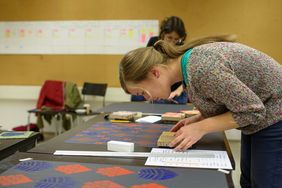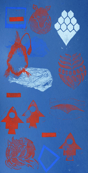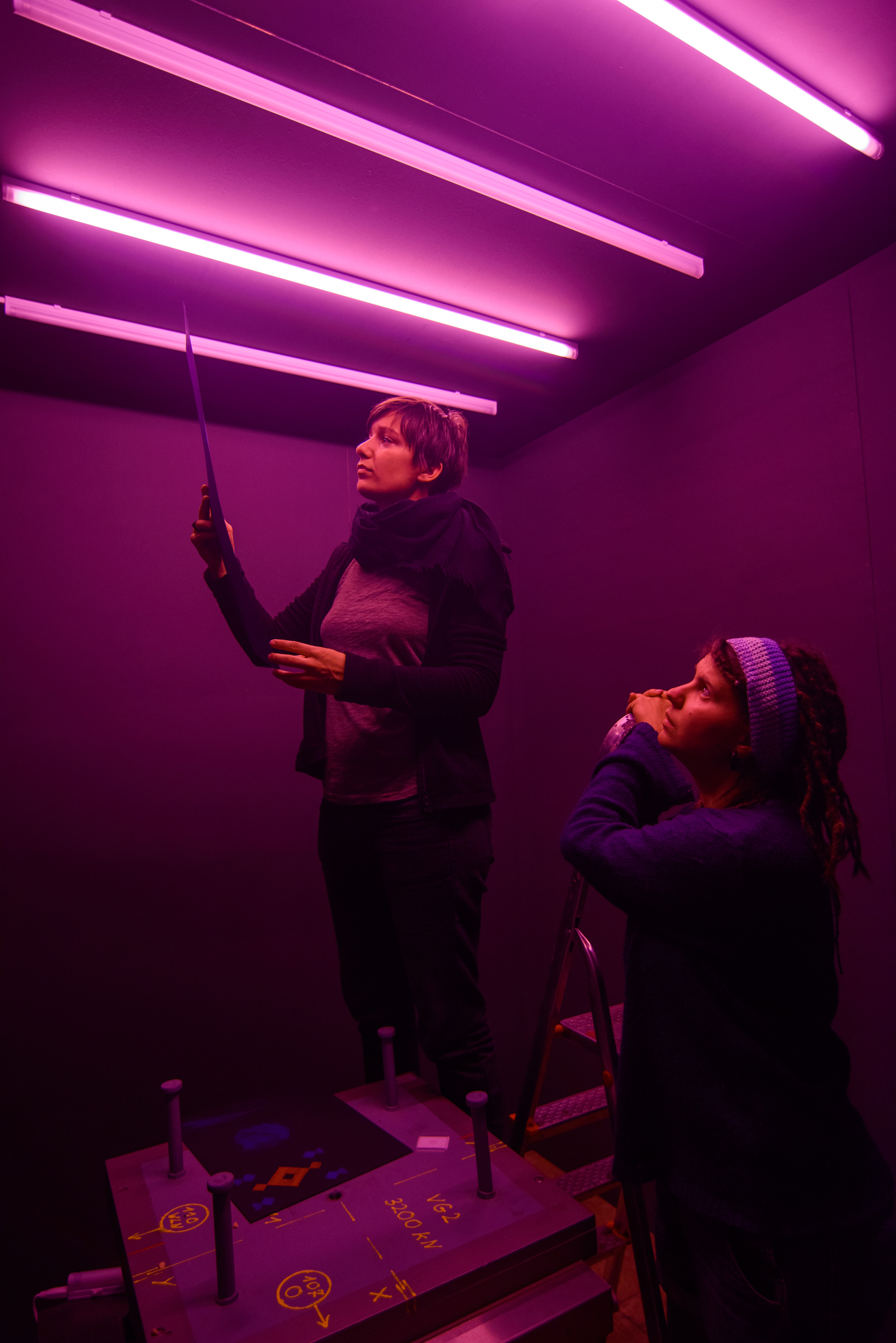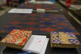 »Das Konzept ist sehr experimentell«, beschreibt Betreuer Torsten Müller von der Fakultät Bauingenieurwesen den Messestand. »Wir manipulieren mit Licht einer Wellenlänge die visuelle Wahrnehmung, indem wir bestimmte Farben der Grafiken einfach verschwinden und wieder auftauchen lassen.« Gaby Kosa ergänzt: »Das ist eine sehr spannende Aufgabe auch für die Gestalter, die ja in der Wahl ihrer Mittel sehr eingeschränkt sind: auf zwei Farben und eine schwarze Pappe.« Die Grafiken mussten nämlich laut Aufgabenstellung in den Farben Blau und Rot gestaltet werden. Je nachdem, ob diese in rotes oder blaues Licht getaucht werden, sind die abgebildeten Zeichen und Illustrationen sichtbar, oder sie lösen sich scheinbar in Luft auf. Die Arbeiten der Studierenden beinhalten zudem ein Geheimnis: aufmerksame Gäste können mithilfe eines Hinweises eine verschlüsselte Botschaft entdecken.