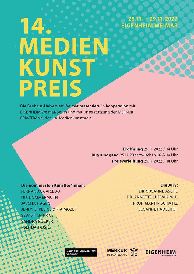 Der Medienkunstpreis wird jährlich vom Studiengang Medienkunst / Mediengestaltung ausgelobt. Alle Lehrbereiche des Studiengangs reichen die besten Abschlussarbeiten der vergangenen Semester ein, die anschließend zu einer Ausstellung zusammengestellt werden. Eine hochkarätige Jury, in diesem Jahr bestehend aus Dr. Susanne Asche (Historikerin), Dr. Annette Ludwig (Direktorin der Direktion Museen Klassik Stiftung Weimar), Susanne Radelhof (Regisseurin) und Martin Schmitz (Verleger und Galerist), vergibt anschließend die Preise.