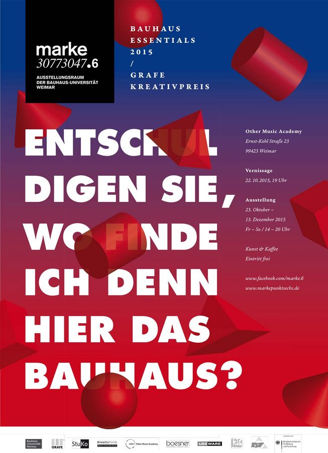 Am Donnerstag, 22. Oktober 2015 wird in Weimar die Ausstellung mit dem Titel »Entschuldigen Sie, wo finde ich denn hier das Bauhaus?« in der Other Music Academy eröffnet. Darin präsentiert die Universitätsgalerie der Bauhaus-Universität Weimar »marke.6« bis 13. Dezember 2015 die Gewinnerinnen und Gewinner des GRAFE-Kreativpreises und der »Bauhaus Essentials«.