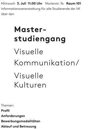 Alle interessierten Studierenden im Studiengang Visuelle Kommunikation sind am Mittwoch, 3. Juli 2013, um 11 Uhr zu einer Informationsveranstaltung zum Masterstudiengang Visuelle Kommunikation/Visuelle Kulturen eingeladen.