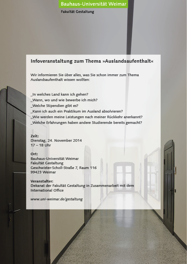 Am Dienstag, 24. November 2015, um 17 Uhr können sich Studierende der Fakultät Gestaltung rund um das Thema »Auslandsaufenthalt« informieren.