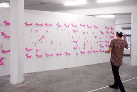 Eine Wand steht im Mittelpunkt der Aktion. Auf der Vorderseite sind pinkfarbene Balloon Dogs installiert, auf der Rückseite werden Künstlergrafiken präsentiert.