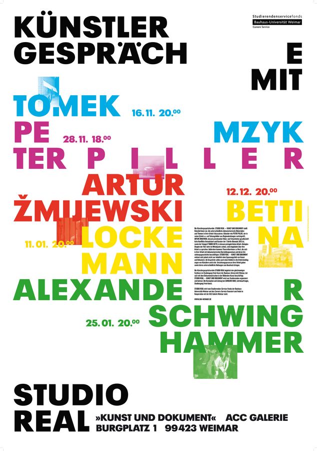 »STUDIO REAL« wird aus Mitteln des Studierendenservicefonds der Bauhaus-Universität Weimar und des Careers-Service finanziert und findet in Kooperation mit der ACC Galerie Weimar statt.