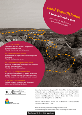 »Landein, landaus nur Langeweile? Keinesfalls! Viel zu entdecken und zu tun gibt es auf dem Land, das wissen wir in allen Fakultäten unserer Universität. Und so laden wir Euch ein, „Land“ während unserer Land.Expeditionen einmal durch die Brille unserer verschiedenen Disziplinen zu entdecken.Weitere Informationen finden sich im Bison im bauhaus.semester unter Labor fürs neue Land!