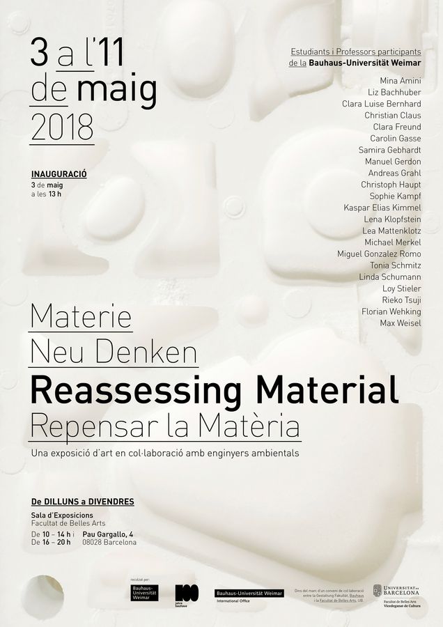 Unter dem Titel »Materie Neu Denken – Reassessing Material – Repensar la Matèria« stellen Studierende der Studiengänge Freie Kunst und Umweltingenieurwissenschaften vom 3. bis 11. Mai 2018 im Ausstellungsraum der Facultat de Belles Arts im Rahmen des Partnerschaftsabkommen mit der Universitat de Barcelona aus.