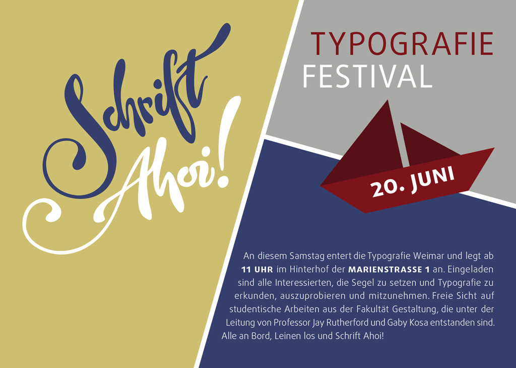 Alle Interessierten sind herzlich eingeladen, gemeinsam mit den Studierenden und Lehrenden die Segel zu setzen und ganz bewusst Typografie, deren Gestaltung, Wirkung und Spielarten zu erkunden, anzuschauen, auszuprobieren und mitzunehmen. Der Fokus des zweisemestrigen Projektes unter dem Titel »Schrift Stadt Bild« lag auf der vielfältigen Auseinandersetzung mit Typografie in der Öffentlichkeit besonders im Stadtraum von Weimar.