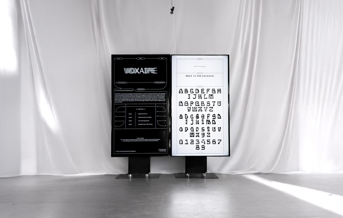 »VOXAIPE – Decoded« ist ein digitales, KI-basiertes Typografie-Tool, das die menschliche Stimme unmittelbar in Schriftzeichen überführt. Anstelle fester Regeln entsteht Typografie hier aus Klang, Rhythmus und Timbre. Das selbst trainierte Large Language Model erzeugt daraus eine lebendige, sich wandelnde Schrift. Dadurch wird unmittelbar sichtbar, wie künstliche Intelligenz den Menschen über Form statt Bedeutung »liest«. Das Ergebnis ist eine grafische Darstellung der Stimme, die zwischen realem Ausdruck und technisch erzeugter Form liegt.