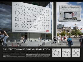 Die jetzt vom ADC preisgekrönte Arbeit »Die 'ZEIT ZU HANDELN!' – Installation« entstand im Rahmen des Projektes »Schland« bei Prof. Werner Holzwarth und Björn Kernspeckt. Darin beschäftigten sich die Studierenden rund ein Semester lang mit dem gesellschaftlichen Deutschlandbild.