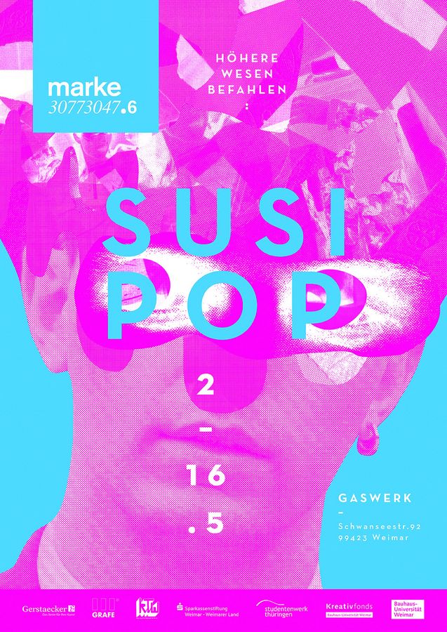 »Höhere Wesen befahlen: SUSI POP« – unter diesem Titel haben sich Studierende der Bauhaus-Universität Weimar im vergangenen Semester mit dem Label auseinandergesetzt. In dem Projekt, das in Kooperation mit der »marke.6« und der ZWINGER Galerie in Berlin organisiert wurde, erarbeiteten sie Herangehensweisen, Sichtweisen auf Medien und das allgemeine Kunstverständnis. Entstanden sind reproduzierte Bilder und entfremdete Medienerzeugnisse in neuen Bedeutungszusammenhängen.