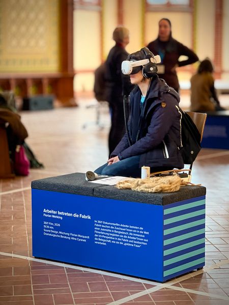 Der künstlerische Mitarbeiter und Absolvent der Visuellen Kommunikation Florian Wehking wurde im XR-Wettbewerb mit dem mit 500 Euro Preisgeld dotierten Jury-Preis für seinen 360°-Film »Arbeiter betreten die Fabrik« ausgezeichnet. Im Dokumentarfilm tauchen die Zuschauer*innen ein in die Welt einer Jutemühle in Bangladesch. Als immersive Filmerfahrung begleiten sie die Arbeiter*innen aus der Ich-Perspektive in die Fabrik und beobachten die Belegschaft, wie sie die ›goldene Faser‹ verarbeitet.