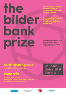 In Anlehnung an den neuen Namen des ehemaligen Landeszentralbankgebäudes in der Steubenstraße 15 »Notenbank«, trägt der Preis den Titel »Bilder-Bank-Preis«. Die Auszeichnung soll jährlich zur summaery vergeben werden und ist Auftakt einer Reihe von Veranstaltungen, die als Forum und Schnittstelle zwischen Studierenden der Fotografie, professionellen Fotografen und der Öffentlichkeit dienen soll.