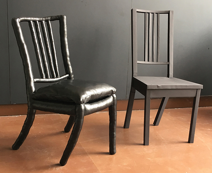 Die Arbeit »Down!« zeigt zwei einzelne, scheinbar gewöhnliche schwarze Stühle, die jedoch aus holzähnlichem Papier und gestopftem Textil bestehen. Obgleich damit auf den ersten Blick funktionstüchtig, versagen sie dem gedachten Benutzer letztlich den Dienst. Als dysfunktionale, geschädigte und erschöpfte Exemplare ihrer Gattung versinnbildlichen sie so das menschliche Verhalten in einer Zeit freiwilliger Selbstausbeutung, das zwischen vorauseilendem Gehorsam und Verweigerung oszilliert.