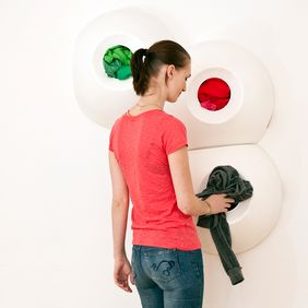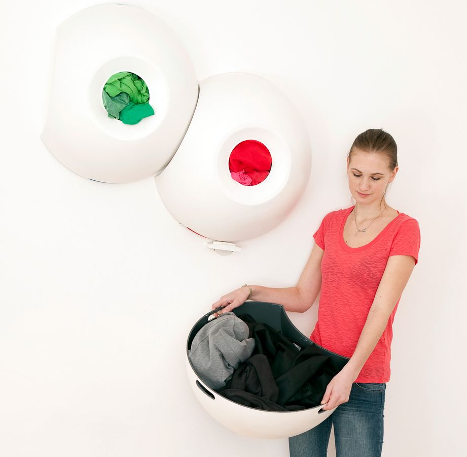 Polyp ist ein Wäschekorb — und ein Wandornament. Die Wäsche wird ganz einfach durch eine vordere Öffnung in den an der Wand befestigten Korb gestopft. Ist der Korb gefüllt, ergibt sich die exakte Menge für einen Waschmaschinengang. Nutzt man mehrere Behälter, kann die Wäsche so leicht sortiert werden. Die Öffnung des Wäschekorbs ist konkav. Daher kann beim Abnehmen des Korbes kein Wäschestück herausfallen. Einfach zu tragen ist das Behältnis dank seiner Einbuchtung, die, arrangiert man die Körbe an der Wand, ein in sich greifendes, interessantes Ornament ergeben.