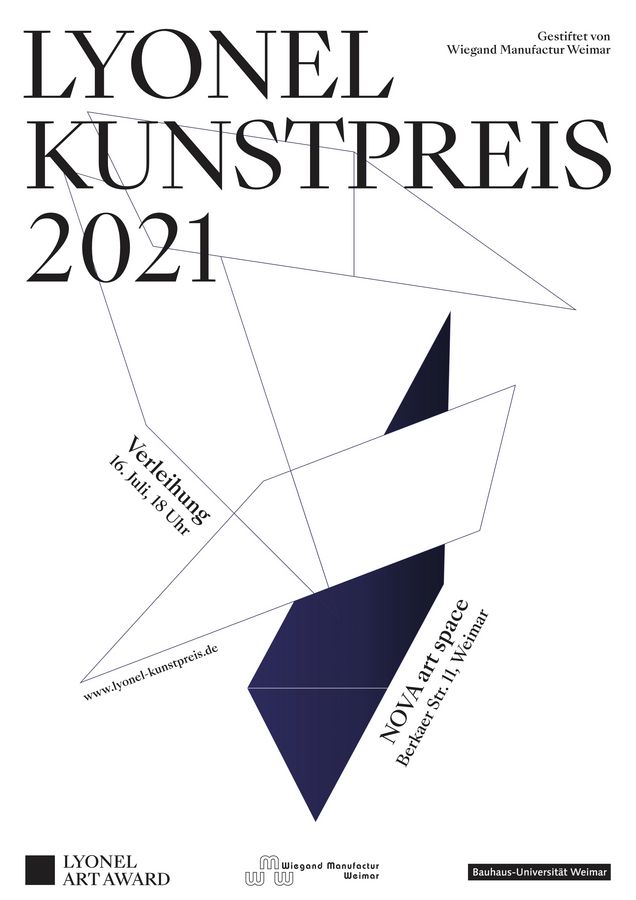 Der Lyonel Kunstpreis wird im Rahmen der Jahresschau »summaery2021« der Bauhaus-Universität Weimar vergeben. Die Preisverleihung findet im NOVA art space, am Freitag, 16. Juli 2021, 18 Uhr, statt.