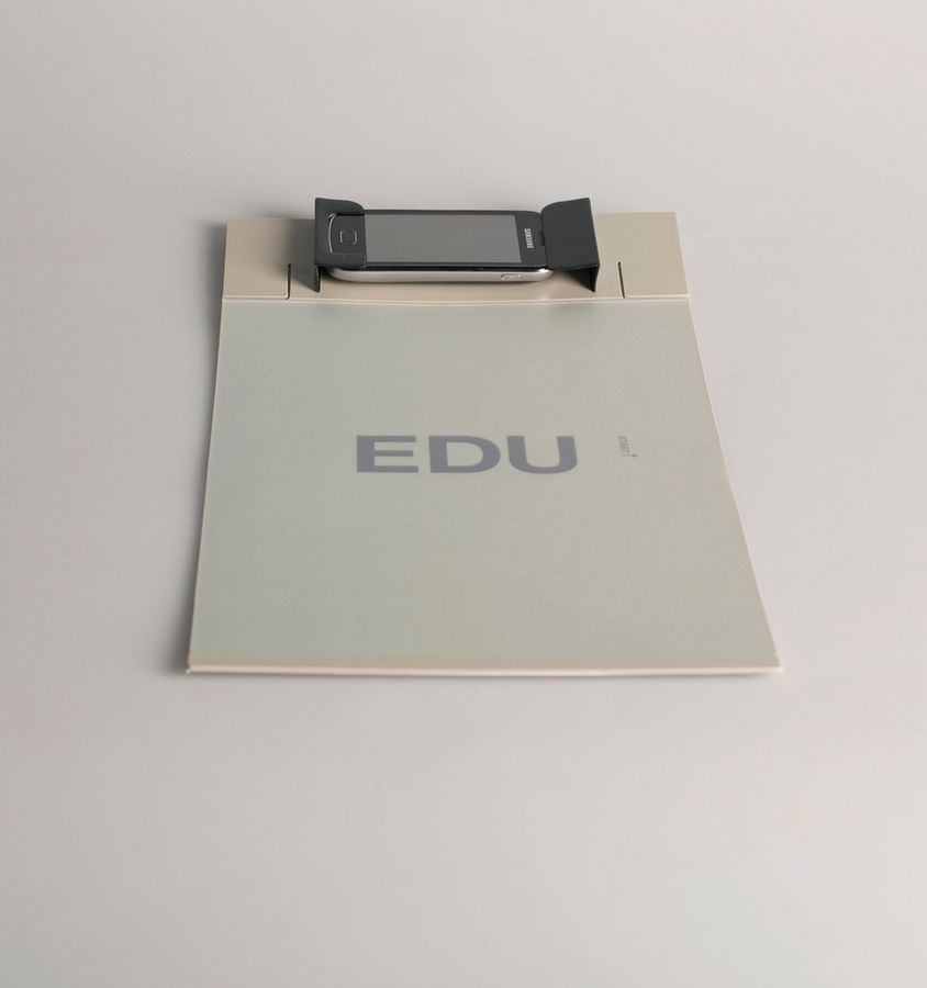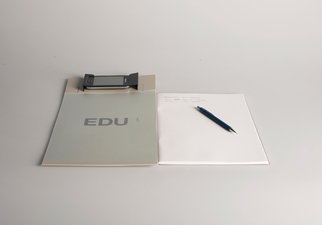 Im Rahmen ihrer Abschlussarbeit an der Fakultät Gestaltung hat sich die Produktdesignerin mit realen Problemen und Wünschen im Schulalltag beschäftigt. Eines dieser Probleme stellt das Smartphone dar, das nahezu jeder Schüler besitzt und ständig nutzt. Anstatt das Handy aus dem Unterricht zu verbannen, bezieht »EDU Buch« es in den Unterricht und in den Schulalltag ein und erhöht nebenbei dessen Akzeptanz. Auf eine flexible Unterlage gesteckt, die als Monitor fungiert, wird das Telefon zum Schulcomputer. Eine Software deaktiviert bestimmte Funktionen, zum Beispiel Telefonieren und SMS, lässt aber den Zugang zu Wissensdatenbanken zu. Wikipedia: Ja – Chatten: Nein.