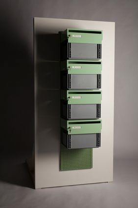 »EDU Spind« widmet sich dem Stauraum für Schülerinnen und Schüler. Ein ausgeklügeltes System von Boxen, die unkompliziert an der Wand zu montieren sind, wird mit normierten Boxen unterschiedlicher Größen bestückt und so zum privaten Schrank. Die ›Schubladenboxen‹ sind problemlos erhältlich und kostengünstig in der Anschaffung. Darüberhinaus gibt es sie in allen möglichen Farben, sodass jede Schule ihren eigenen ›Look‹ entsprechend des Corporate Design kreieren kann. Die Verbindung zu »EDU Buch« stellt eine eingebaute Sicherheitssteckdose dar, an der das nun willkommene Smartphone aufgeladen werden kann. »EDU Spind« nimmt im Gegensatz zu gängigen Spind-Formaten nicht viel Platz ein und kann auch in kleineren Räumen eingesetzt werden. Ein weiterer Clou ist der Briefschlitz, der auch zu analoger Kommunikation einlädt.