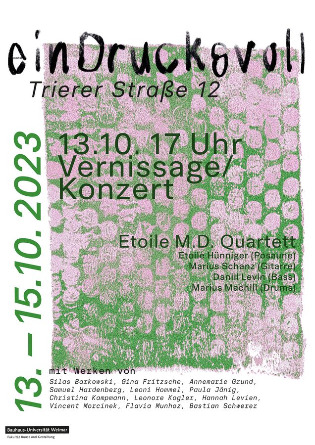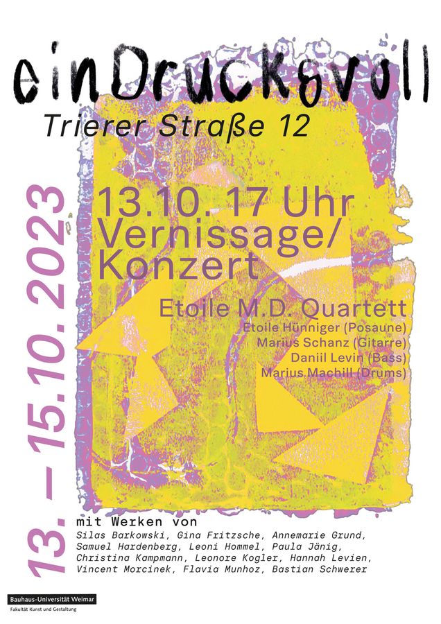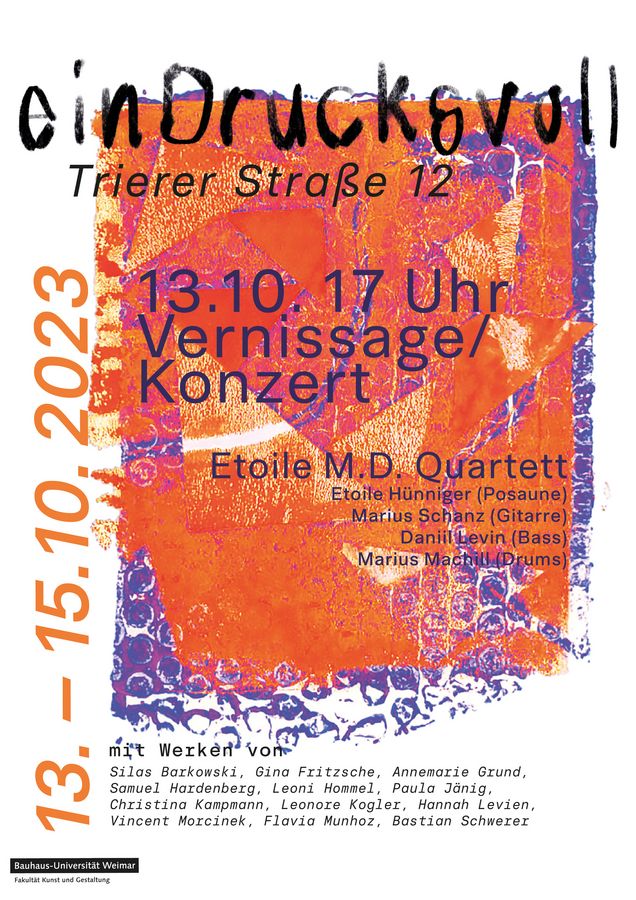 Vom 13. bis 15. Oktober präsentieren die Studierenden des Fachmoduls »einDrucksvoll« in einer Ausstellung ein vielfältiges Panorama individueller Projekte, die im Rahmen des Fachkurses entstanden sind. Interessierte sind herzlich zu Vernissage mit Konzert und Ausstellung eingeladen.