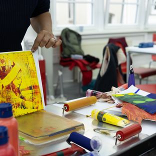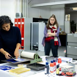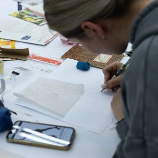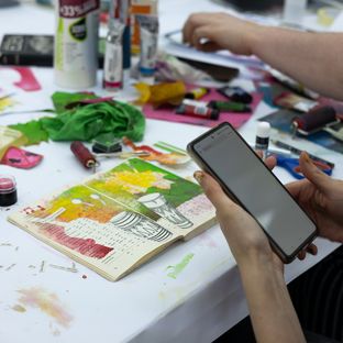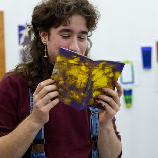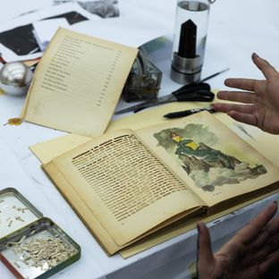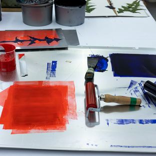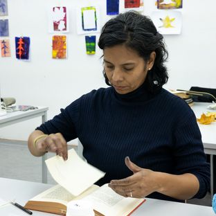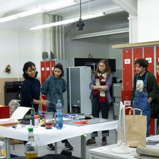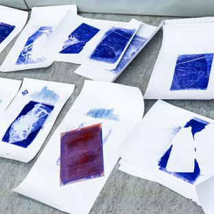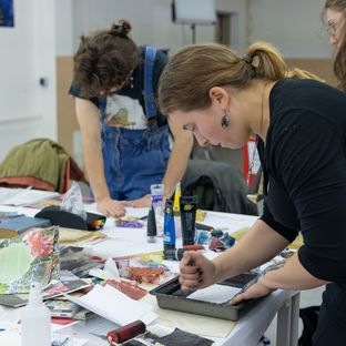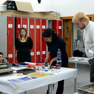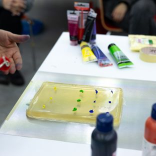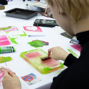 Dazu wurde experimentell mit der Technik der Monotypie gearbeitet, unter anderem mit Gelatineplatten und Stempeln. Es wurde über die Taxonomie und die Formen gesprochen, die das Buch als Kunstwerk annehmen kann, und über die Wahl der gedruckten Materialien, um eine visuelle Erzählung zu schaffen. Abschließend gab es Tipps für die Buchgestaltung sowie Raum für Feedback und die Präsentation der vorgestellten Künstlerbücher.