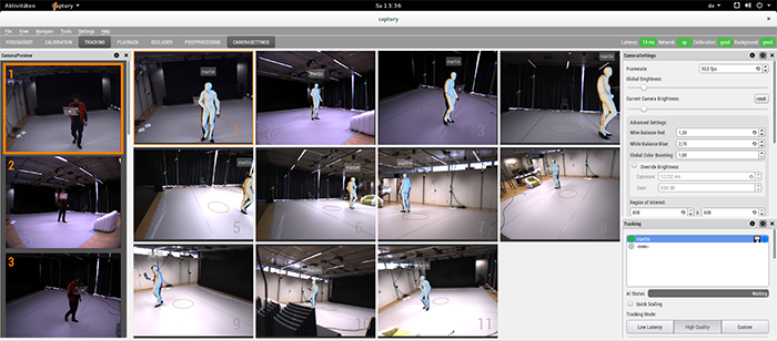 Auf der Performance Plattform erforschen Mitarbeiter und Studierende der Bauhaus-Uni menschliche Interaktion im Raum und realisieren performative und installative Setups. Ein markloses Mehrpersonen-Tracking-System zeichnet menschliche Bewegung auf einer Fläche von 6,00m x 6,00m mit Hilfe von zwölf Kameras auf, ermittelt 3D-Bewegungsdaten in Echtzeit und ermöglicht so interaktive Installationen.