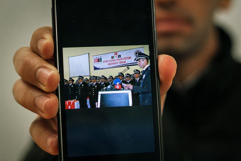 Mein Portemonnaie ist leer, ich habe alles verloren als ich nach Deutschland kam. Das einzige was ich habe ist dieses Foto von mir. Das auf der rechten Seite bin ich, wie ich eine Rede auf meiner Absolventenfeier halte, nach meiner 6-monatigen Polizeiausbildung in der Türkei.
