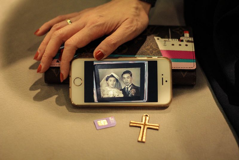 Ich habe mich letzten September taufen lassen und kurz danach einen Deutschen geheiratet! Aus diesem Grund habe ich mein Taufkreuz immer bei mir in meinem Portemonnaie. Es ist ein gutes Omen das Kreuz bei mir zu tragen. Ich reise oft zwischen Deutschland und China und das Kreuz gibt mir Sicherheit. Damit ich meine Familie erreichen kann, trage ich eine chinesische Simcard bei mir. Es gibt viele Apps und Internetseiten, die nur über das chinesische Netz zu erreichen sind. Außerdem habe ich ein Foto meiner Großeltern dabei, sie sehen darauf wunderschön aus. Zu meiner Hochzeit sind sie nach Deutschland gekommen und noch einen Monat geblieben. Ich liebe sie beide sehr!