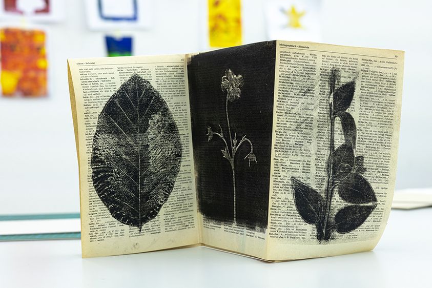 Dazu wurde experimentell mit der Technik der Monotypie gearbeitet, unter anderem mit Gelatineplatten und Stempeln. Es wurde über die Taxonomie und die Formen gesprochen, die das Buch als Kunstwerk annehmen kann, und über die Wahl der gedruckten Materialien, um eine visuelle Erzählung zu schaffen.