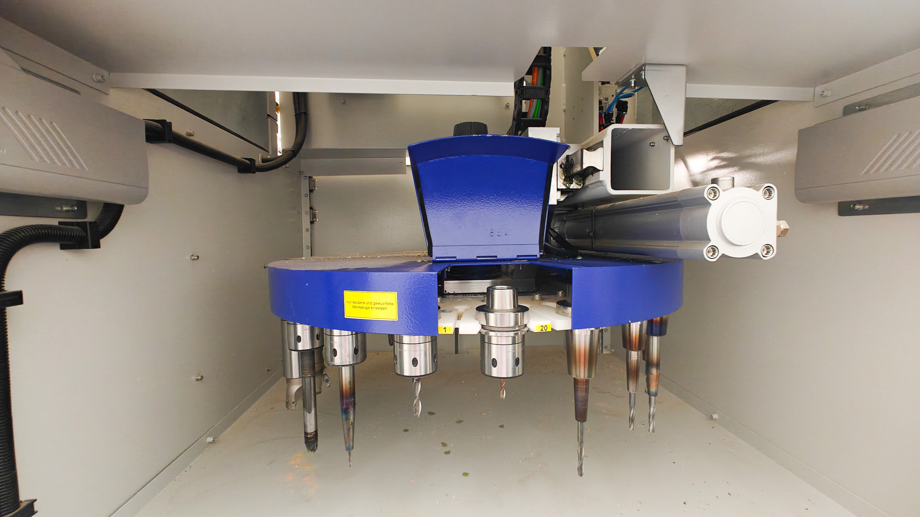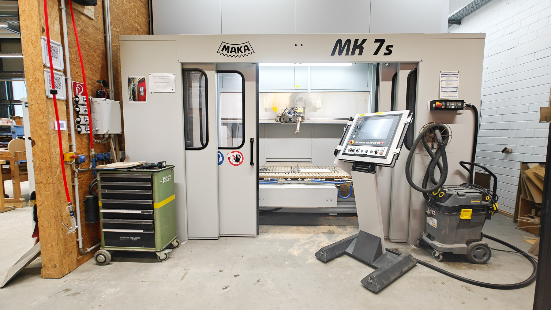 Kernstück der Werkstatt ist ein 5-achsiges CNC-Fräsbearbeitungszentrum mit einem Arbeitsbereich von ca. 2 × 1 × 1 Metern. Ergänzend steht ein 3D-Scanner zur Verfügung, um Objekte digital zu erfassen.