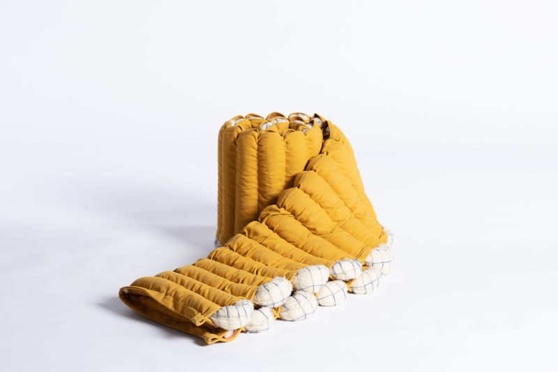 Gefasst in einer textilen Hülle ergeben die Stränge Wolllage, eine flexible Polsterlage. Je nach Einsatzort werden verschiedene Eigenschaften der Wolle wie Schalldämmung, Isolation, Polsterung oder Luftfilterung genutzt. Diese lässt sich als Klimavorhang an der Wand, als Futon auf dem Boden oder zusammengerollt als Pouf nutzen.