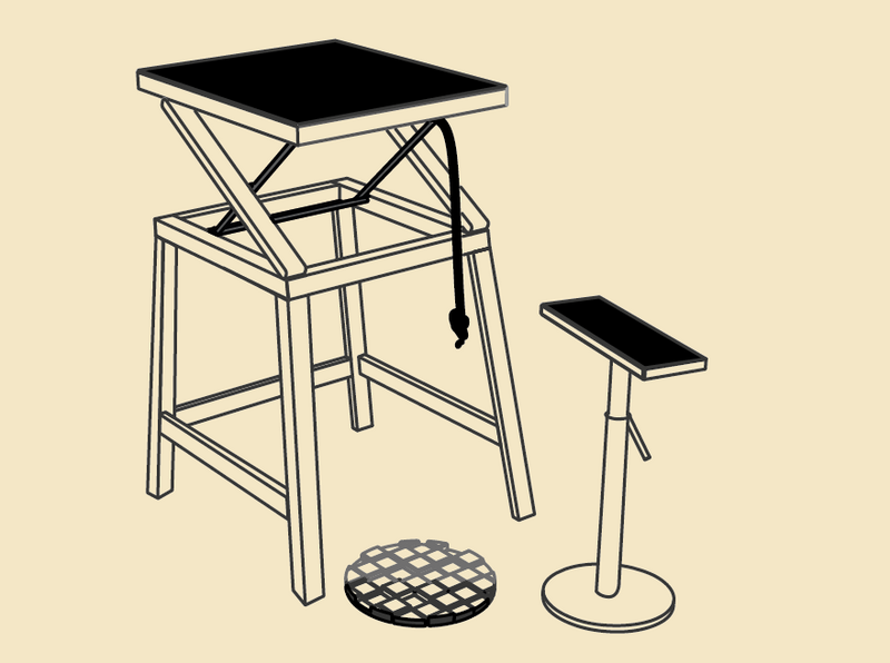 Entwürfe: Die Arbeit umfasst drei Entwürfe, welche für einen dynamischen Arbeitsplatz geeignet sind: Ein höhenverstellbarer Tisch, ein höhenverstellbarer Schemel und eine Stehmatte, die zu verspielten Pausen einlädt.