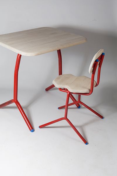 Ausgehend von intensiver Beobachtung am Albert Einstein Gymnasium in Böblingen analysierte ich die momentan auf dem deutschen Schulmöbel-Markt erhältlichen Produkte. Mein primäres Ziel war Tisch & Stuhl langlebiger und freundlicher zu gestalten. Anders als sonst sind alle Holz-Teile nicht genietet, sondern geschraubt, so dass sie bei Bedarf ausgetauscht werden können.