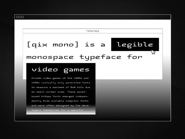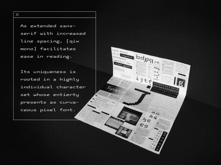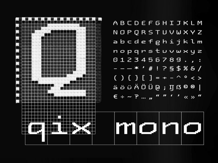 [qix mono] ist eine gefällige und gut lesbare Synthese aus Pixel-Art-Stil und Benutzungsfreundlichkeit. Inspiriert von monospace Bitmap-Schriften aus der Arcade-Game-Ära, passt sich [qix mono] heute nahtlos in neuentwickelte retro-style Videospiele ein. Studien über legasthenie-freundliche Schriften sowie die Beteiligung von Menschen mit Lese-Rechtschreib-Schwäche verhalfen [qix mono] schließlich zu ihren markanten, leserlichen Eigenschaften.