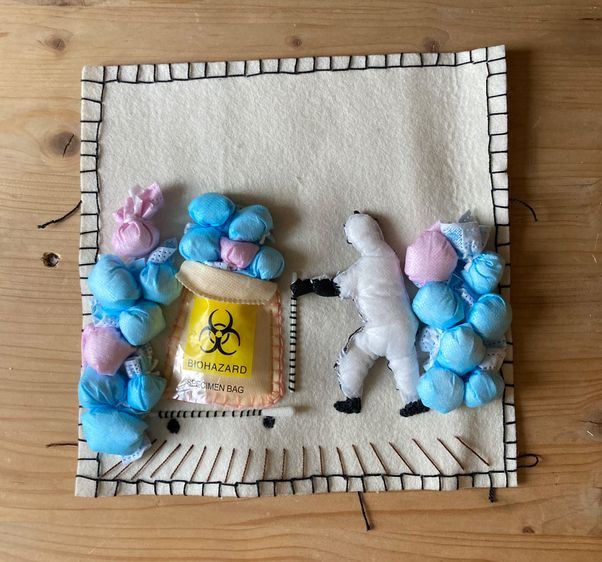 Diese gesteppte Komposition verkörpert Sinneserfahrungen sowohl von außen als auch von innen. Während der Covid19-Pandemie wurde mir mehr denn je bewusst, was es bedeutet, ein Zuhause zu haben. I
