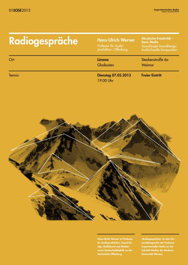 »Radiogespräche« sind eine Veranstaltung der Professur Experimentelles Radio an der Fakultät Medien der Bauhaus-Universität Weimar.