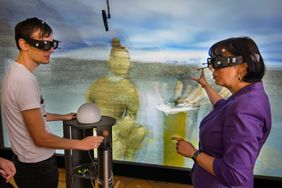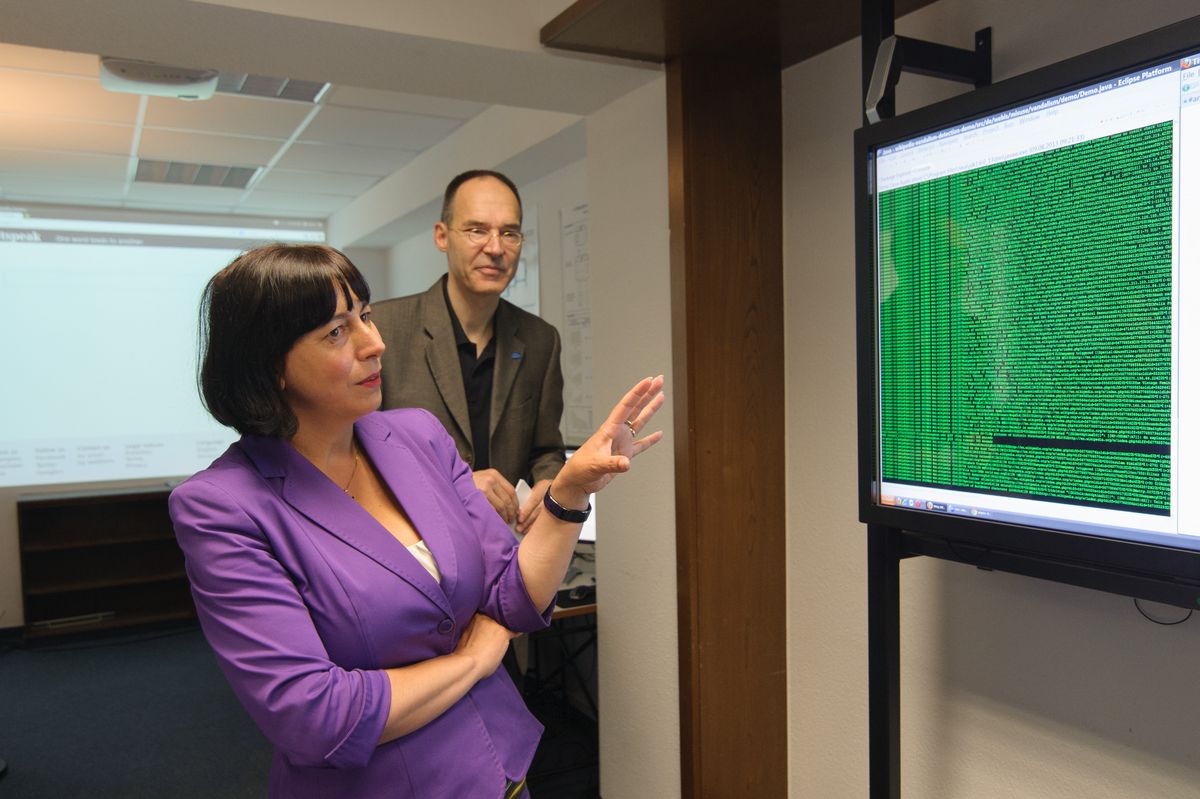 In den Laboren der Medieninformatik erhielt Walsmann anschließend eine beeindruckende Präsentation verschiedener Forschungsprojekte. Prof. Benno Stein stellte gemeinsam mit wissenschaftlichen Mitarbeitern anschaulich vor, wie an Themen wie Big Data, Information Retrieval oder Data Mining geforscht wird. Demonstriert wurden beispielsweise der Plagiatefinder picapica, das Projekt Wikipedia Vandalism und die Formulierungshilfe für englische Texte Netspeak. Anschließend konnte Walsmann beeindruckende 3D-Visualisierungen im Virtual Reality Lab betrachten und mithilfe interaktiver 3D-Projektionen ihrem virtuellen Gegenüber auf einer Burg sogar die Hand geben.