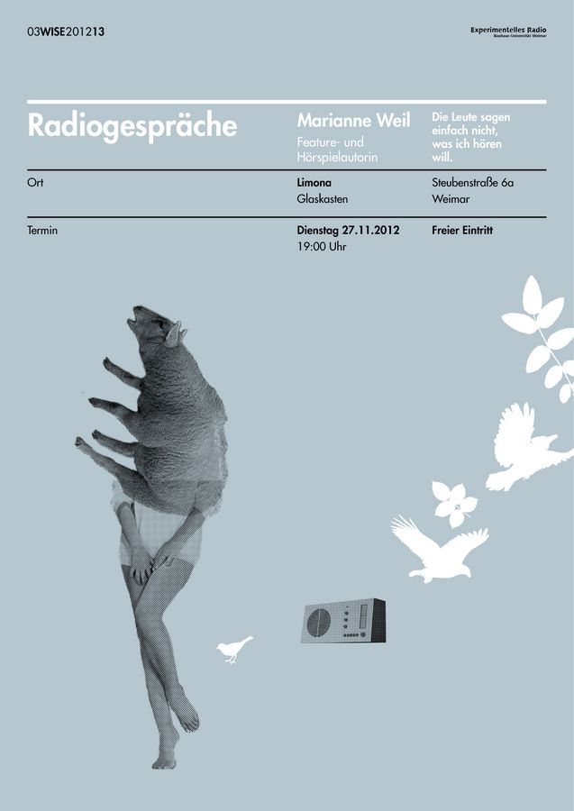 In den Ton-Archiven schlummern abertausende Stunden Material mit unendlich vielen Stimmen von unendlich vielen Orten: Mitschnitte aus dem Gerichtssaal, dreistündige Unterhaltungssendungen, Politikbesuche im Zoo, Leute auf der Straße und vieles mehr. Diese Töne sind faszinierend oder langweilig, fremd oder vertraut, prägnant oder diffus. Wer damit etwas anfangen will, muss ganz rabiat vorgehen und zuerst die Oberfläche zerstören. Etwas pathetisch formuliert: er muss die O-Töne aus dem Zusammenhang befreien, isolieren, und sie für eine neue Rolle in einem neuen Kontext präparieren. Kurzum, er ist Chirurg und Schöpfer zugleich. Zur Montage im Radio spricht die Feature- und Hörspielautorin Marianne Weil am Dienstag, 27. November 2012, 19 Uhr, im Rahmen der Radiogespräche an der Bauhaus-Universität Weimar.