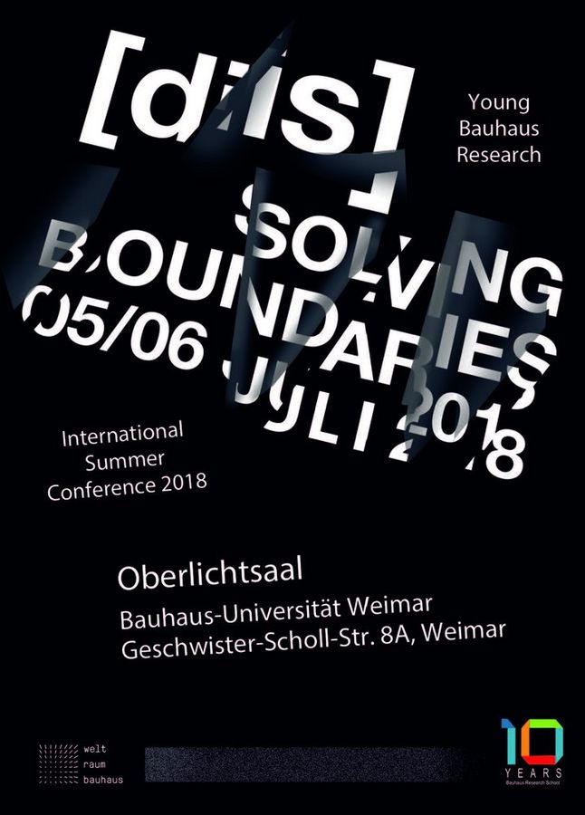 Die Bauhaus Research School (BRS) unterstützt seit zehn Jahren den wissenschaftlichen und künstlerischen Nachwuchs der Bauhaus-Universität Weimar auf ihrem Weg zur Promotion. Seit Herbst letzten Jahres feiert die BRS ihr zehnjähriges Jubiläum – vom 4. bis 8. Juli 2018 findet daher die Veranstaltungsreihe »[dis]solving boundaries« statt.