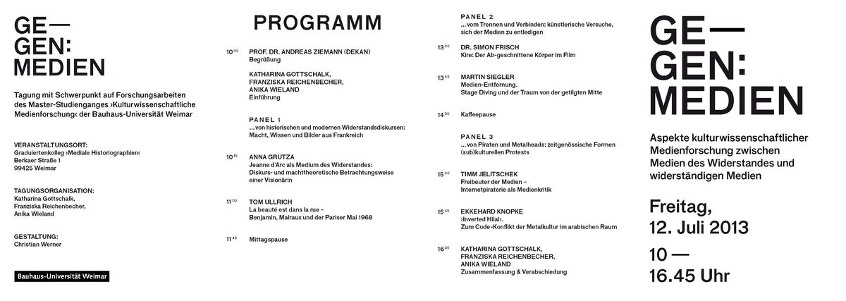 Ort: Graduiertenkolleg ›Mediale Historiographien‹, Berkaer Str 1, 99425 Weimar