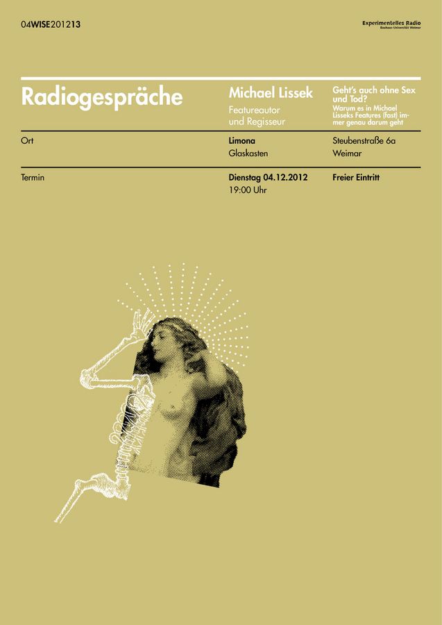 Featureautor und Regisseur Michael Lissek weiß wie er Aufmerksamkeit erregen kann – doch das allein reicht ihm nicht. Er kommt zum Radiogespräch nach Weimar, weil er nicht nur leidenschaftlich gerne Features macht, sondern auch ganz fabelhaft über sie sprechen und diskutieren kann, obwohl er ganz offen zugibt, nicht den blassesten Schimmer zu haben, wie er sein rohes Material anordnen soll.