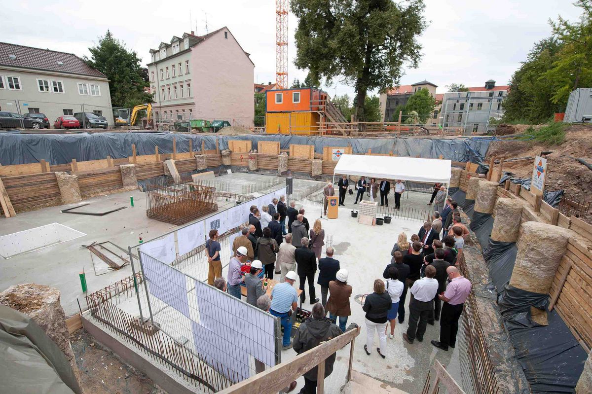 Gemeinsam mit dem Thüringer Minister für Bau, Landesentwicklung und Verkehr, Christian Carius, legte der Rektor der Bauhaus-Universität Weimar, Prof. Dr.-Ing. Karl Beucke, das erste Fundament für das interdisziplinäre Forschungszentrum, in dem Informatiker, Ingenieure, Gestalter und Geisteswissenschaftler zukünftig in modernsten Laboren zusammenarbeiten werden.