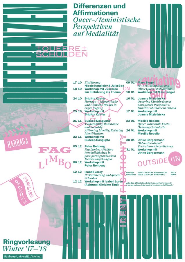 Die Ringvorlesung collagiert aktuelle Positionen, Methoden und Diskussionen der Gender- und Queer Studies in den Medienwissenschaften. Diskutiert werden vielfältige Relationen zwischen Medien und Genderdifferenzen. Das Verhältnis von Kritik und Affirmation ist leitend und stellt eine doppelte Perspektive dar, indem beide Bewegungen mit Prozessen der Differenzbildung verbunden werden. Vielfalt und Kritik sind dabei ebenso zusammen lesbar wie Differenz als Nichtübereinstimmen mit dem Gegebenen und der Affirmation von Veränderbarkeit.
